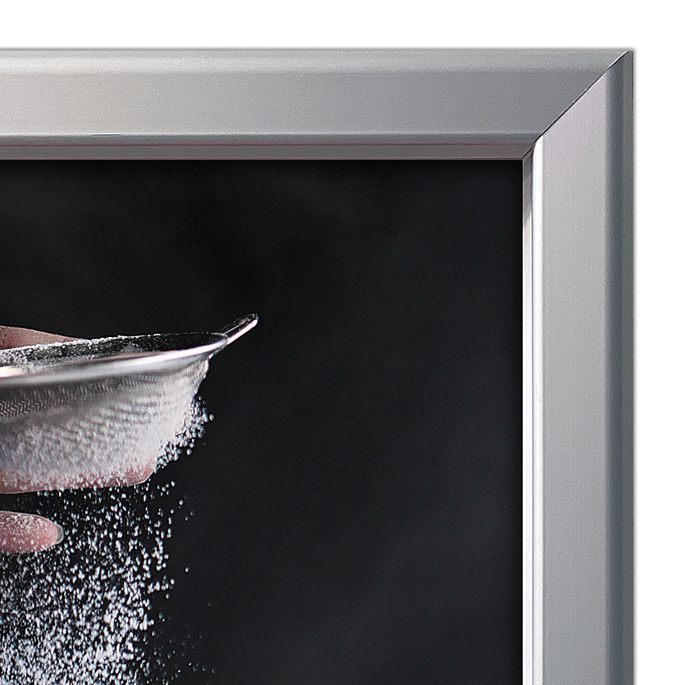 Sølveloxeret aluminium A3 klapramme med 32 mm profil og hjørner i gering. 1,5 mm PS bagplade samt APET antirefleks frontplade. Inklusiv skruer og plugs til montering.